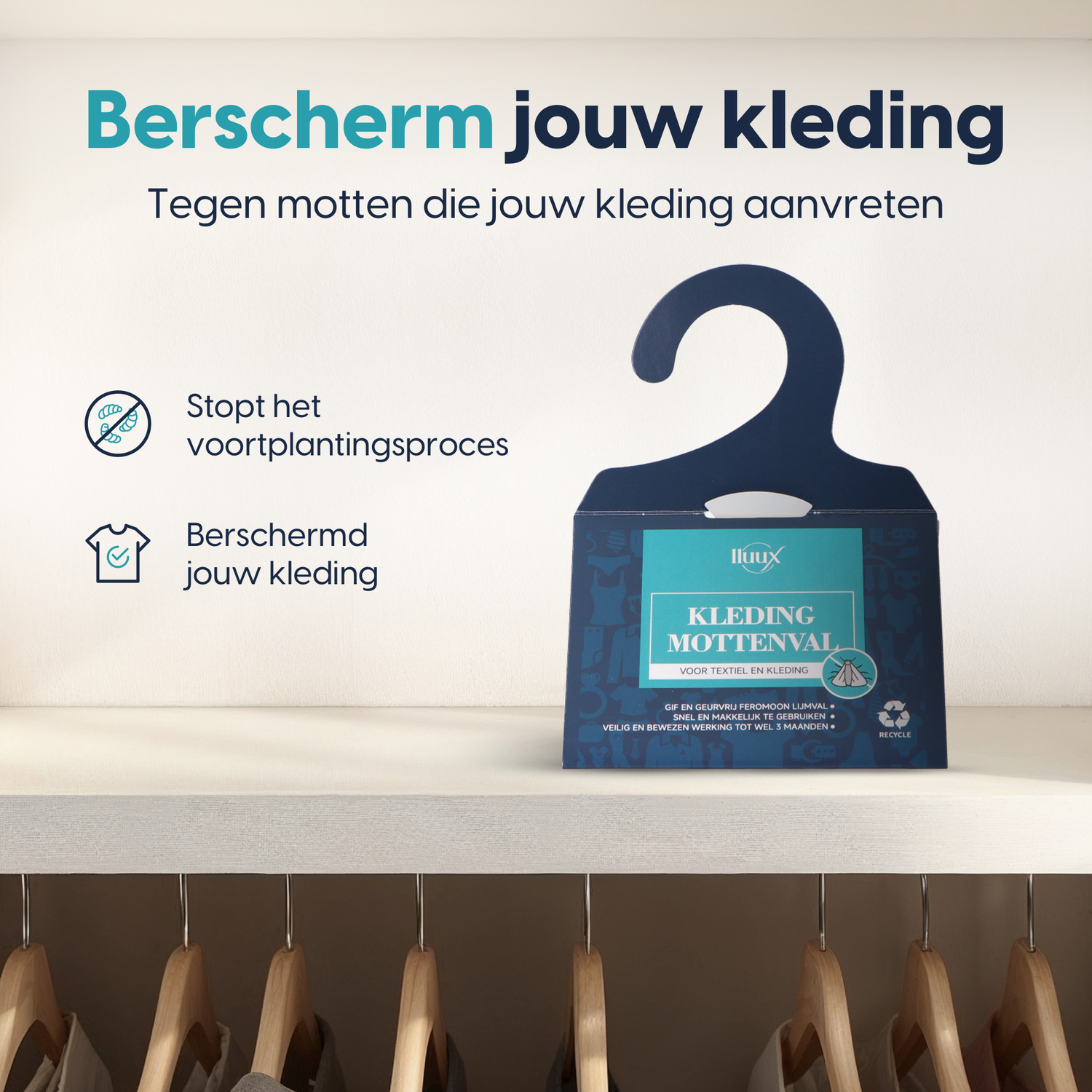 De kledingmottenvallen van lluux lokken en vangen motten met een natuurlijke feromoonlokstof — geurloos, gifvrij en effectief. Zo blijft je kleding langdurig beschermd.