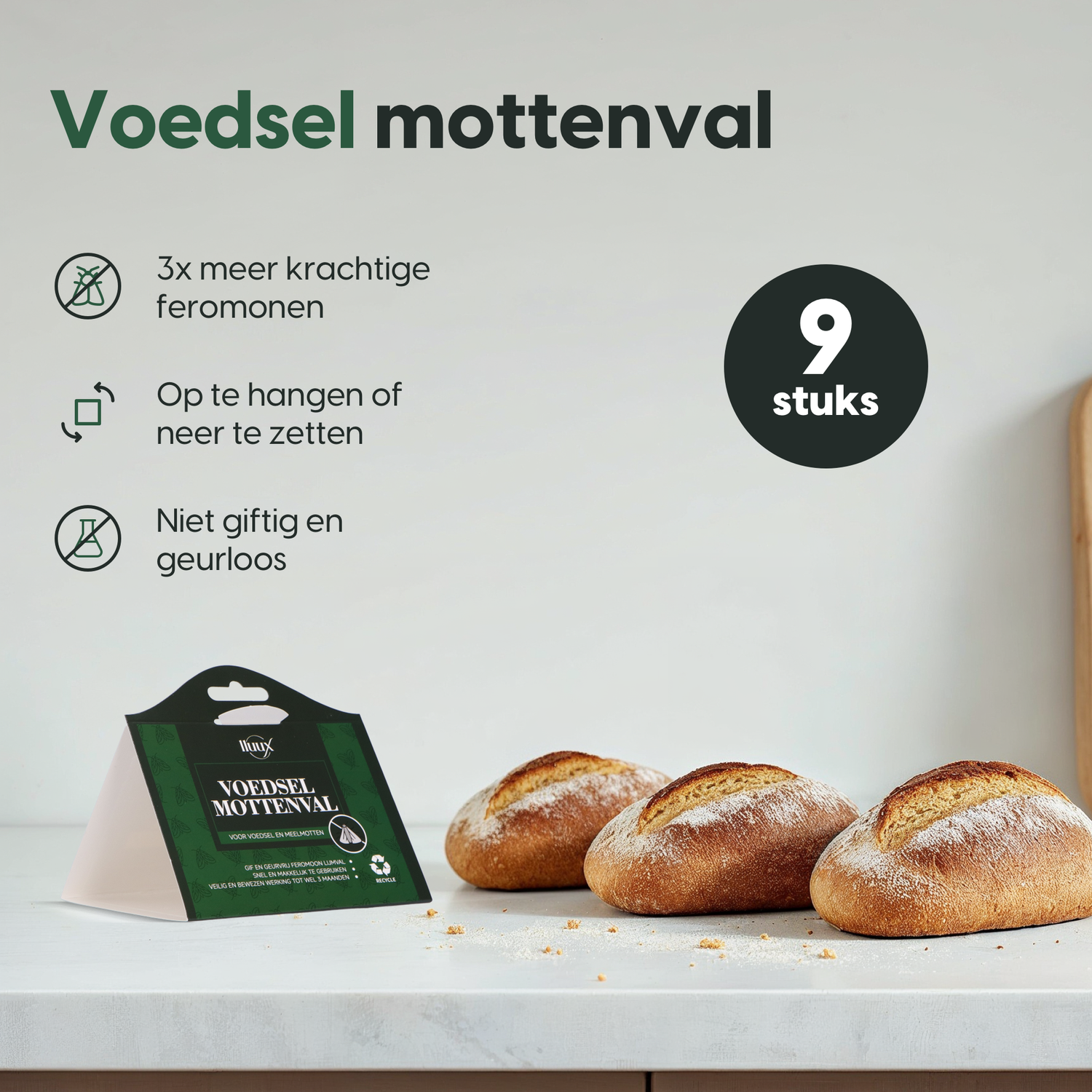 De voedselmottenvallen van lluux zijn volledig gifvrij en geurloos, zodat ze veilig te gebruiken zijn in je keuken of voorraadkast. Dankzij het slimme, compacte ontwerp kun je ze eenvoudig neerzetten of ophangen — schoon, discreet en zonder nare luchtjes.